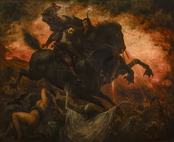 Hell gallops, breath of rot and flame,