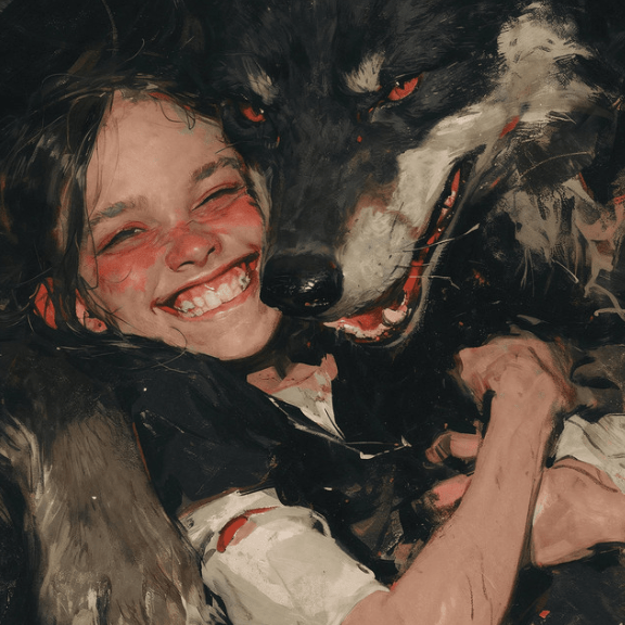 “Holding the beast as if it was her brother, her lover, her reflection. Wrapping her arms around its neck fearlessly. The fervor of someone who has long shed the illusion of difference. When the smiles are too wide, teeth are bared, there is a grotesque ecstacsy, it’s not innocent, not wicked, it’s something far stranger, as if she’s smiling through a scream she forgot to finish. A Face streaked in dirt, the cheeks raw with the heat of exertion or ritual, and yet, radiating joy… a joy too sharp, too manic, like a flame that’s beginning eat its own fuel.