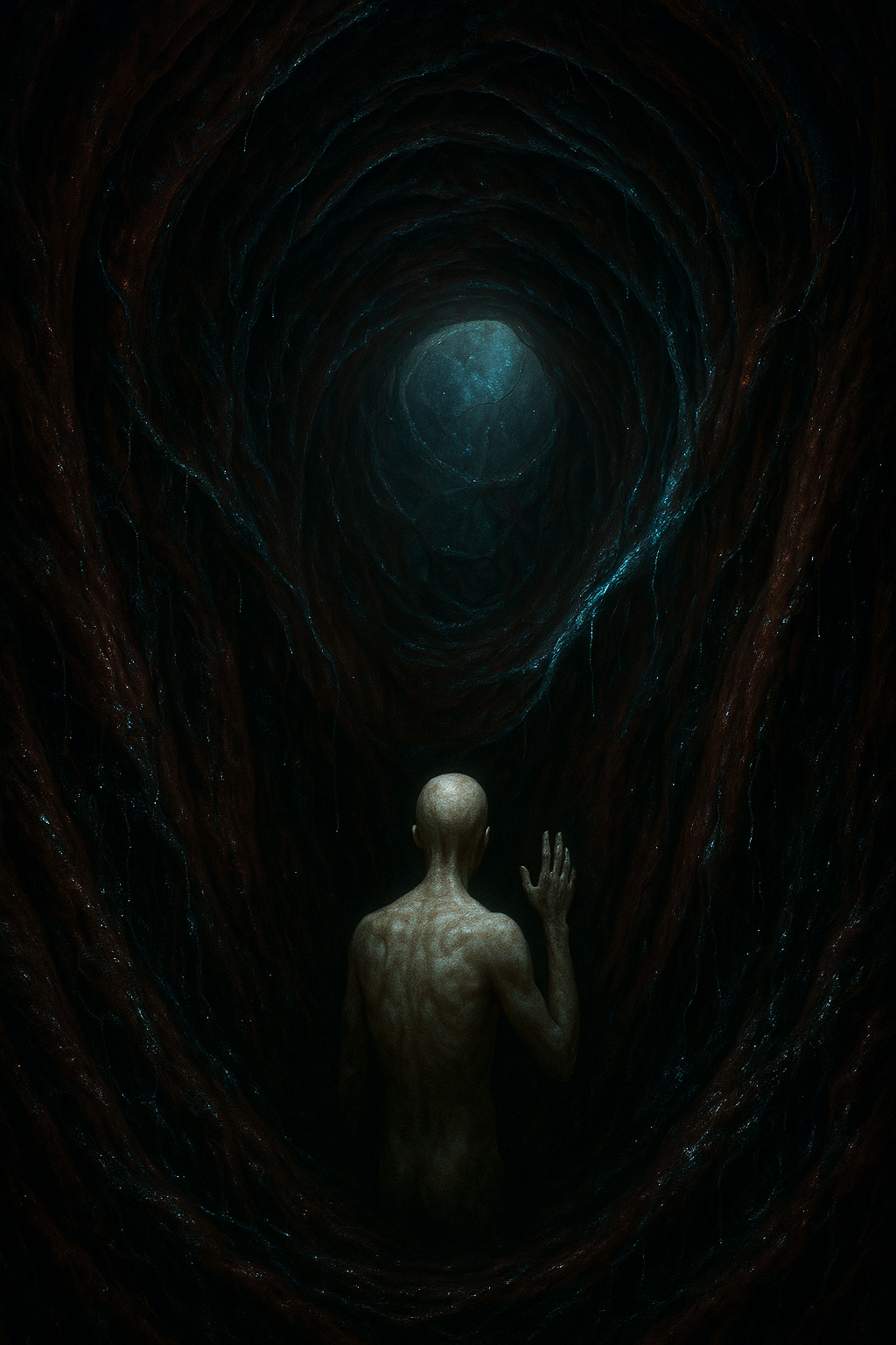 The Darkness Moves thick, yet, there’s no direction. So Many battles fought within. I am inside it and it keeps swallowing me, yet, it’s not hungry. The air tastes of iron and rust but the body breathes anyways. Stupidly obeying its nature, its cage. I raise my hand, i don’t intend escaping nor resisting. I just want to exist in the motion, this gesture without meaning. A wave no one will see. The walls of the beast pulse an Algor Rythm, it secretes my thoughts away. I can hear the fluids dragging behind the skin, a tide that carries me deeper into it, i can see the place where no light remembers its origin. There’s no bargain here, no promises, no ressurection. The beast is not evil, just infinite. It just devours everything, it cannot do otherwise. And i allow myself to be carried, because i cannot too, do otherwise. Death is not an event, it’s a process already completed, the silence before birth, the endless pause between clicks, in a metronome that was never wound. And so i keep waving, from the maw of the beast. To nothing, to no One, to the Absurd.